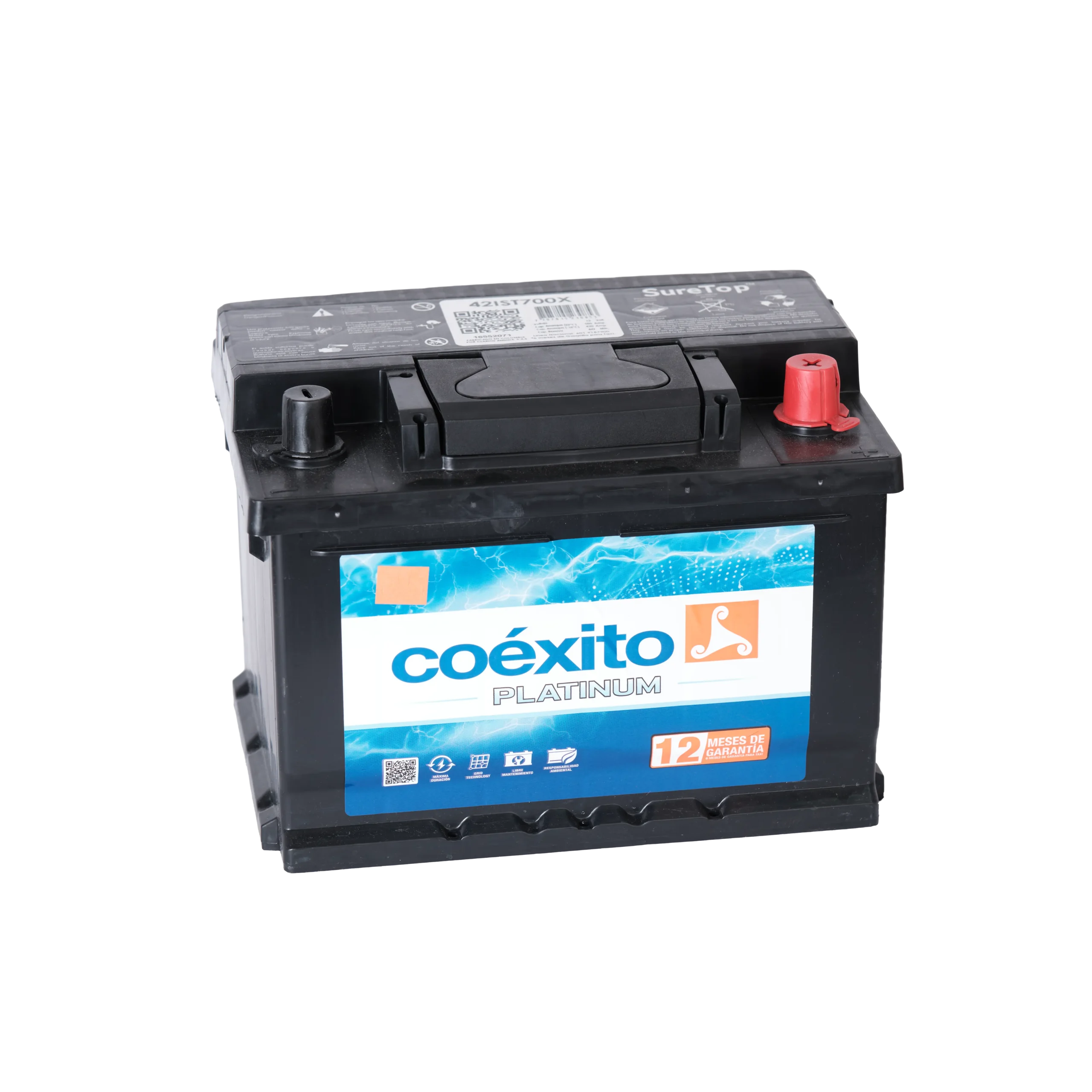 - Descripción: Una batería de plomo-ácido, utilizada para arrancar el motor de un vehículo o generador y para alimentar los sistemas eléctricos del equipo cuando el motor no está en marcha. El modelo Platinum de la marca Coexito indica un nivel de rendimiento y calidad. En la imagen se especifica que cuenta con 12 meses de garantía.