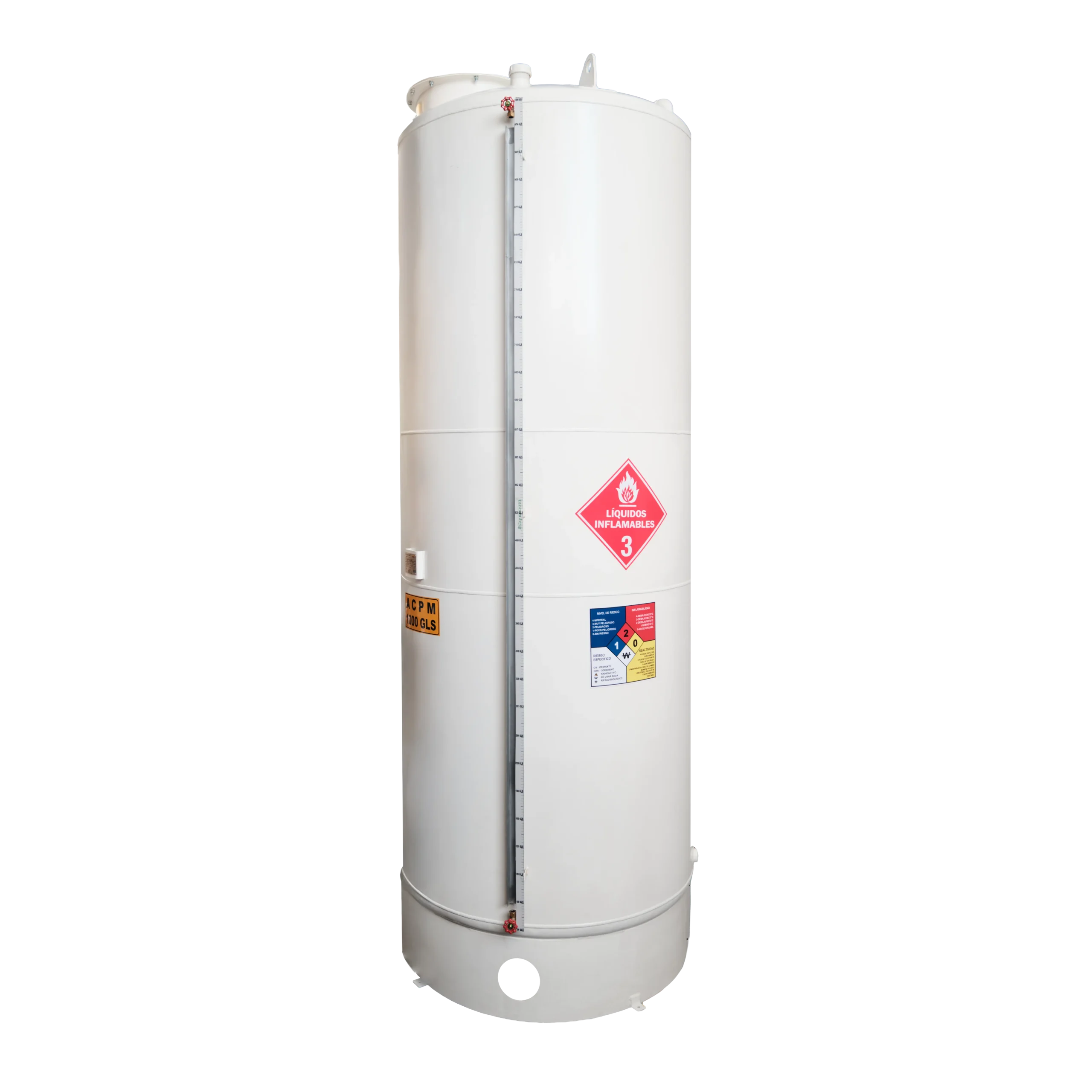 - Descripción: Este es un tanque de almacenamiento vertical, de gran capacidad, diseñado para almacenar de manera segura líquidos inflamables como el diésel (ACPM). En la imagen se puede observar una etiqueta de advertencia que indica «Líquidos Inflamables» con el número de clase de peligro 3, y una escala de medición en el exterior para verificar el nivel del líquido.